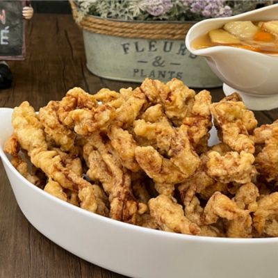 trozos de pollo deshuesado frito, con masitas de arroz envuelto en una salsa dulce o dulce picante, con sésamo y cebollín. Estos sabores te transportaran.